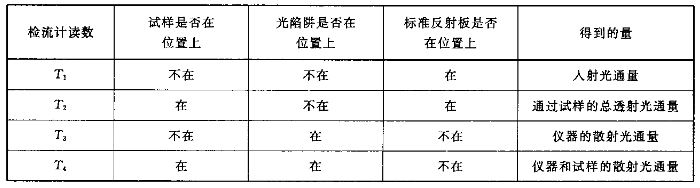 調(diào)節(jié)霧度計零點旋鈕,使積分球在暗色時檢流計的指示為零。當(dāng)光線無阻擋時,調(diào)節(jié)儀器檢流計的指示為100,然后按下表操作,讀取T1、T2、T3和T4。
